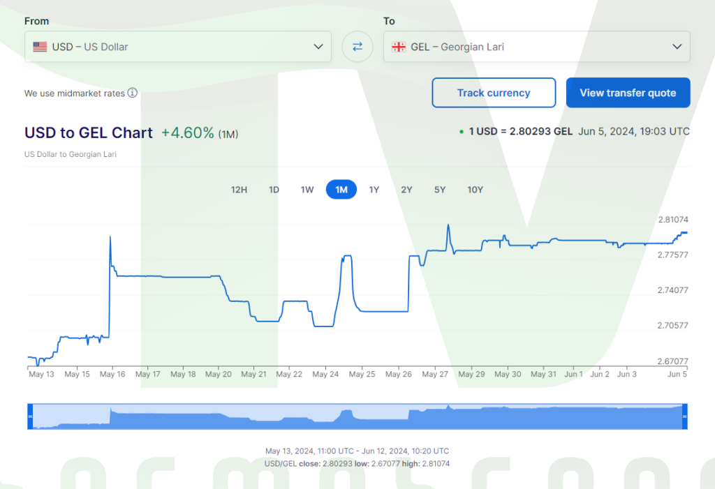 „რუსული კანონის“ (უცხოური გავლენის გამჭვირვალობის შესახებ) ხელახლა გააქტიურების ფონზე მიმდინარე საპროტესტო აქციების გამო ეროვნული ვალუტა რისკის ქვეშ დადგა მკვეთრი ვარდნა ლარმა 15 მაისიდან დაიწყო და 28 მაისს, აშშ დოლართან მიმართებით 2,8-იან ნიშნულს გადასცდა.